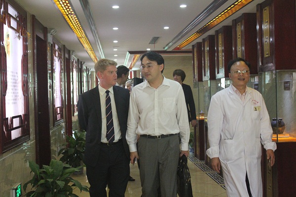 在国家主席习近平对英国进行国事访问期间,10月22日下午,应湖南省卫计委邀请,英国蓝山(英国)医疗合作有限责任公司项目总监乔纳森·普罗柏茨等英方有关医疗机构人员一行7人,在卫计委国际合作处相关同志的陪同下到我校附属中西医结合医院进行考察访问,医院领导朱克俭、吴玉华、徐京平、苏新平及相关科室主要负责人陪同考察。