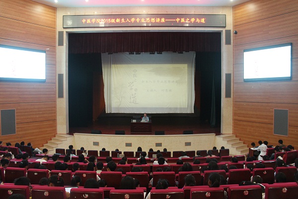 10月19日晚,中医学院“新生入学专业思想——中医之学与道”讲座在大学生活动中心举行。讲座由大学副校长何清湖主讲,中医学院院长喻嵘、党总支副书记李晓红、新生兼职班主任、学生科老师及全体新生一起聆听了本场讲座。讲座由喻嵘主持。