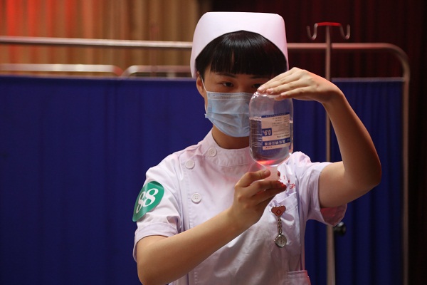 个人一等奖获得者郭元正在进行密闭式静脉输液考试。