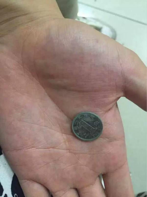 龙龙妈妈买菜回家时,把手中几枚硬币随手放在桌上,一岁十个月大的龙龙一直在客厅玩耍,龙龙妈妈放好菜回来,看到龙龙用手指自己的嘴巴很难受的模样。龙龙妈妈看看桌上,发现硬币少了一个,于是赶紧带龙龙去当地的镇医院就诊。医生为龙龙做了胸部 X 线检查,发现龙龙食管内一个圆形的金属异物,就像一枚硬币。在医生的详细询问下,最终确定,龙龙是误食硬币导致的消化道堵塞。由于龙龙还不足 2 岁,消化道尚在发育中,因此硬币就卡在了他的食管内。当地医院考虑到龙龙年龄太小,不敢进行处理,后几经辗转才到湖南中医药大学第一附属医院。