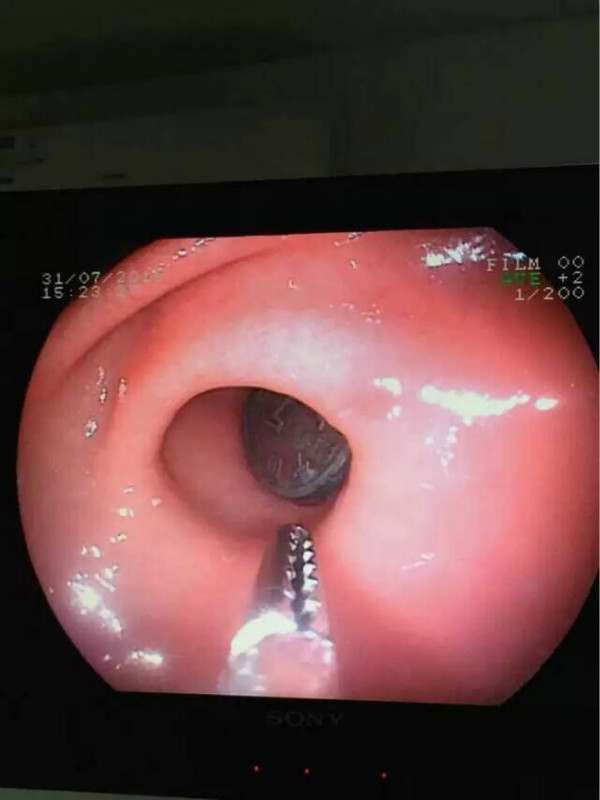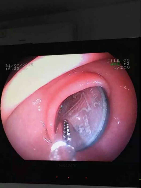 7 月31 日 ,龙龙 到湖南中医药大学第一附属医院就诊时,硬币已经卡了三天,该院吴洋鹏副主任医师接诊后发现这个硬币已经进入到胃内,为避免开刀,最好的办法就是通过胃镜把它取出来。因为龙龙年纪还比较小,不懂和医生配合,如果要做胃镜,必须采用麻醉。麻醉时有气管痉挛、喉头水肿、胃内容物上涌进入气管导致窒息的意外,这就需要一名非常有经验的麻醉师。其次,儿童的食管壁较薄,硬币又比较大,在取硬币的时候,有可能会造成对食管壁的损伤引起食管穿孔,这需要一名内镜技术高超的医生,同时还要有经验丰富的助理配合,大家齐心协力才能把龙龙的风险降到最低。后来,经过麻醉科、内镜中心、外科紧急会诊讨论后,决定给龙龙进行全麻 + 气管插管下胃镜取出硬币,同时全程监护。当吴洋鹏医生把胃镜伸进胃内,在胃窦发现了这枚硬币。他用异物钳牢牢夹紧硬币,通过管道小心翼翼地把硬币取了出来,前后只有 2 分钟就解决了问题。通过胃镜观察了龙龙的食管壁,没有发现损伤、出血,在场的医护人员都松了口气,孩子从入院到出院还不到 24 小时。