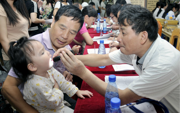 附一院儿科主任王孟清教授正在为一个前来预约敷贴的小朋友辨寒热
