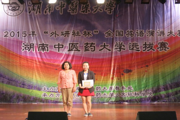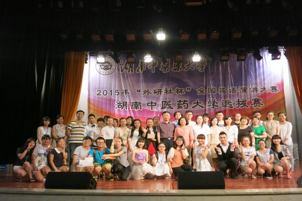 6月11日晚,2015年湖南中医药大学英语演讲比赛暨“外研社”杯全国英语演讲大赛湖南中医药大学选拔赛在大学生活动中心举行。人文社科学院党总支副书记叶利军教授、外语系毛英主任、英语专业教研室和大学英语教研室的教师代表,以及学生科老师出席了此次活动并担任此次大赛评委。