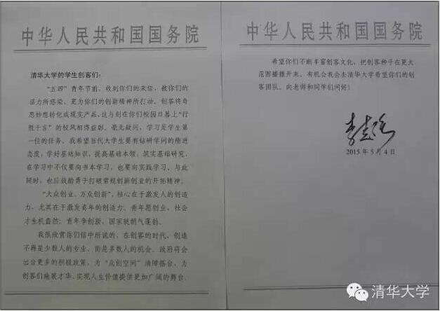 2015年5月4日,在五四青年节到来之际,清华大学的学生创客们收到了一份特殊的青年节礼物——李克强总理的回信。总理在回信中,充分肯定了大学生创客们所具有的勇于打破常规创新创业的开拓精神,希望他们要有钻研学问的精进态度,不仅要向书本学习,也要向实践学习;不断丰富创客文化,把创客种子在更大范围播撒开来。总理的回信,字里行间渗透着党和国家对青年一代学生的充分信任和殷切期望,让清华大学学生创客们深受鼓舞。