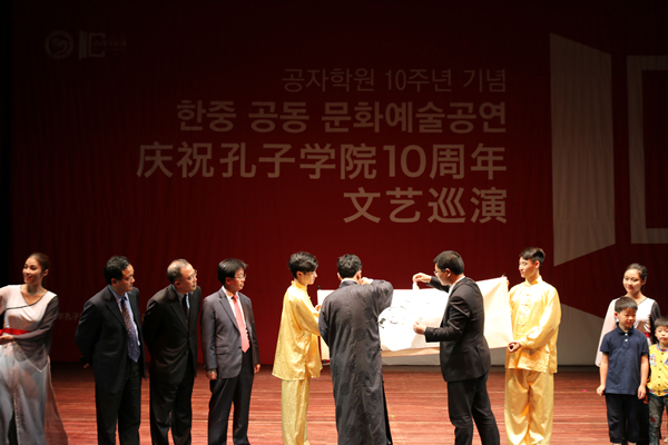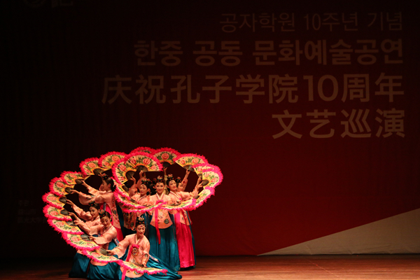 在金仁喆教授发表致辞后,演出正式开始。在九十分钟的表演里,有歌舞、艺术舞蹈、时装秀、戏曲、书画、武术和民乐演奏等多种文艺形式交织进行,整台晚会环节流畅、内容饱满,多方位、多角度、多形式展示了中国文化及艺术魅力,格调高雅、清新,观赏性极强。其中《开门红》、《中国功夫》、《多彩大中华》、《说唱脸谱》、《北京欢迎你》等节目得到了在场观众的良好互动,将演出气氛推向高潮。本次演出为益山市人民及孔院师生打开了另一扇了解中国文化的窗口。作为回礼,益山市市立舞蹈团也在主办方的盛邀之下,进行了精彩的演出,展示了韩国传统艺术的独特魅力,并将演出推向了另一个高潮。