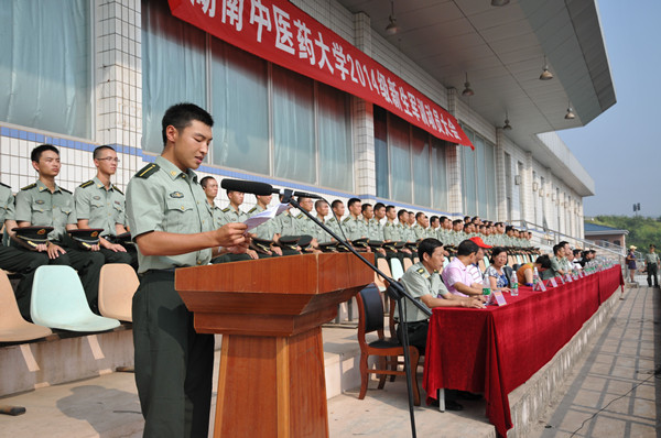 针灸推拿学院新生代表在发言中表示将听从指挥、服从管理、虚心学习、严格训练,更加自信、自爱、自强。教官代表表示会以良好的军人形象带领大家、以过硬的本领引导大家,认真履行应尽职责、坚决执行规章制度,与新生一起成长、共同进步。