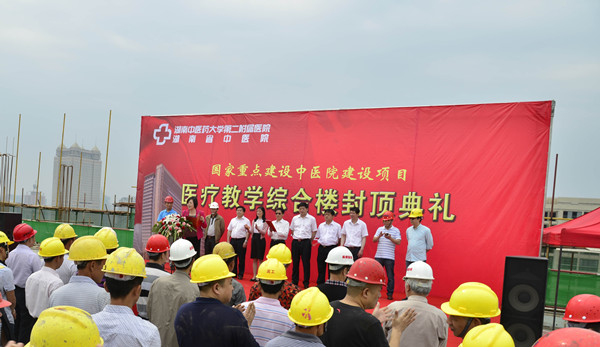 5 月 21 日 上午 9 时 58 分,伴随着声声响亮喜庆的爆竹声,承载着几代附二院职工梦想的医疗教学综合大楼土建工程顺利封顶。校长廖端芳,校长助理、医院院长熊辉,医院党委书记伍一文及相关院领导、医院中层干部、各建设单位员工代表约 200 人参加了封顶仪式。仪式由伍一文主持。仪式上,大学、医院领导及到场嘉宾共同为医疗教学综合楼工程注入了最后一灌水泥。