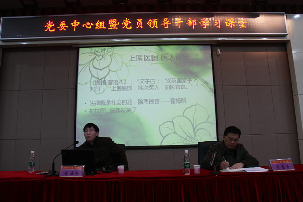 黄惠勇以“案例通古今,针砭话人文”高度评价了蒋海松博士的讲座,认为讲座信息量大,针对性强,学术研究广博,理论思考深刻。从法治文化、人文精神等入手,针对丰富案例,将五千年湖湘文化洋洋洒洒尽皆囊括,对湖湘文化进行了纵横上下的全面总结、反思,对历史人物、时政现象评价到位、适度,直面湖湘法治文化、人文精神的同时,对湖湘中医药文化、典故等也如数家珍,难能可贵。讲座尤其紧密结合了湖南实际,体现了湖南精神,对于大家充分认识相关现象、理解相关精神、提高思想认识等,有着积极作用与意义。黄惠勇强调,全体同志务必要利用好党委中心组学习这一载体,加强学习,开阔眼界,在学习中接轨时代精神和时代正能量,不断提升政治素质。