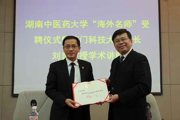 12 月 5 日下午,我校在国际交流中心报告厅举行“海外名师”受聘仪式暨澳门科技大学校长刘良教授学术讲座。校长廖端芳、副校长彭清华、国际教育学院、中医学院相关负责人及师生代表等参加仪式并听取讲座。
