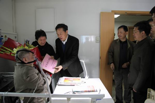 宋智富一行来到欧老病房,为病榻上的欧老送上省道德模范荣誉证书、奖杯以及慰问金。宋智富关切地询问了欧老的健康状况,叮嘱欧老要保重身体,多多休息,把身体养好,健康高寿。他说,元旦节快到了,按照省委宣传部和省文明办的安排,代表省委宣传部许又声部长前来看望欧老,提前拜节。欧老带着呼吸机坚持看病的动人事迹感动了很多人,也鼓舞了很多人,宣传部门务必要进行大力宣传,在全社会树立好人有好报、好人应得到社会尊重,好人应成为社会明星的良好思想和风气。黄惠勇嘱咐随行的医院领导,务必要照顾好欧老的生活起居,尽力满足欧老各方面的需要。领导们的关怀令欧老感动不已,在病床上双手作揖连连致谢。