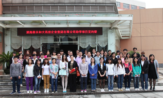 5 月 7 日下午,我校与湖南养天和大药房企业集团有限公司助学项目签约暨助学金发放仪式在国际教育学院报告厅举行。副校长何清湖、葛金文、养天和集团总裁李能、副总裁张恩深等领导与嘉宾出席。仪式由学生工处处长谭琥主持。学工处副处长章小纯及学工处工作人员、部分教师与学生代表共同参加了此次仪式。