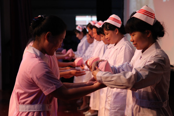 在慷慨激昂、鼓舞人心的“燕尾之旅、天使之梦”诗朗诵之后,还举行了护理之星的颁奖仪式。方森、刘亚萍等 6 名等学生获得护理之星的称号,手语舞蹈《最好的未来》舞姿轻盈动人。“护士之歌”大合唱后,授帽仪式正式开始。全体 2012 级护理专业的同学们依次上台,由老师们戴上充满护士职业气息的燕尾帽,这是一种净化心灵的职业洗礼,现场气氛圣洁而庄严。