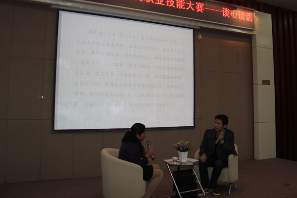 本次竞赛分为基础知识测试与微博写作、班情熟知、自我介绍与展示、谈心谈话四个环节。比赛中,参赛选手对个人情况、工作特色和特长风采进行了简单介绍;基础知识测试与微博写作环节是辅导员对 开展学生工作应具备的业务知识和理论水平进行展示;谈心谈话环节则是根据抽取谈话序号,辅导员以 2 人一组分别扮演老师和学生 2 种身份的方式开展限时十分钟的谈话,帮助学生解决学习、生活和工作中的各种问题。这些项目都考察了辅导员在具体的学生工作中综合运用有关法律法规和教育学、心理学、职业生涯规划、学生日常事务管理等方面的知识和技能,以及发现、分析和解决学生具体问题的能力。