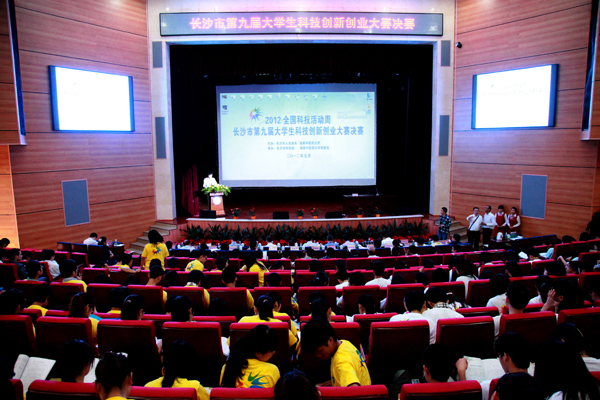 5 月 6 日上午,长沙市第九届大学生科技创新创业大赛决赛在我校含浦校区举行。此次大赛由长沙市人民政府与我校共同主办、长沙市科技局和我校科技处联合承办,是一场以强化大学生创业意识,培养大学生创业能力为宗旨,促进大学生主动创业为目的的大型赛事。共有包括国防科技大学、中南大学、湖南大学等在内的 13 所高校参赛。长沙市人民政府副秘书长刘秋成、我校校长廖端芳、党委副书记、副校长黄政德、副校长葛金文及长沙市科技局局长胡石明等出席大赛。长沙市政府办公厅、市科技局、市教育局、市科协、市创业富民办等相关单位领导、各参赛大学科技处处长及带队老师、相关投融资机构代表、金融机构代表及学生代表等 700 余人观摩了比赛。