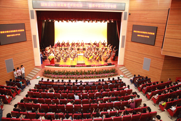 为更好地普及高雅音乐、培养高尚的审美情趣、促进学生全面发展, 5 月 10 日晚,以“走近大师、聆听经典、陶冶情操”为主题的高雅艺术进校园——湖南中医药大学专场交响乐音乐会在我校含浦校区大学生活动中心举行。我校副校长葛金文、湖南省歌舞剧院院长、国家一级指挥肖鸣先生等领导和嘉宾出席并聆听了本次音乐会。