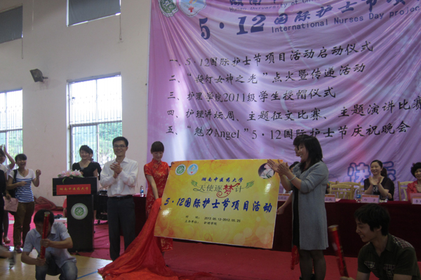 5 月10 日下午,护理学院 2012 年“天使逐梦计”5 · 12 国际护士节项目活动启动仪式在含浦室内体育馆一楼举行。党委宣传统战部虢剑波部长、护理学院陈燕院长、校学生工作处章小纯副处长、校团委王召亿副书记、护理学院党总支向宇副书记、护理学院教研室主任、学生科老师,湘杏学院、中医学院、医学院分团委书记,以及护理学院学生共计 600 余人参加了启动仪式。