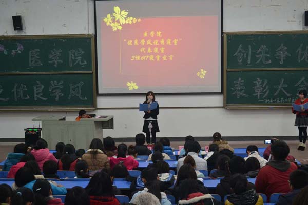 为深入推动创先争优活动开展, 通过表彰先进,在学生中树立榜样, 促进学生自主性学习、创造性学习和研究性学习,推动学院学风建设向纵深发展, 3 月 1 日下午 ,医学院在 1506 教室举行“创先争优”优良学风表彰大会。院党总支书记、院长张秋雁教授、学生科老师以及各班级代表参加大会。