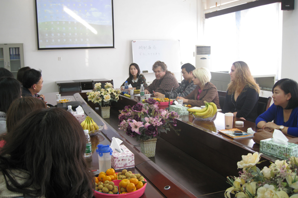 会上,英语专业教研室主任毛英副教授介绍了英语专业《英语口语》课程概况与教学大纲,谢粤湘老师现场示范了英语口语教学,外籍教师们指出了中西方学生在学习过程中所体现出的在个性、方法等方面的差异。中外教师畅所欲言,就英语口语的教学现状、 课程建设、教学方法以及如何加强中西文化交流 等进行了热烈深入的探讨。