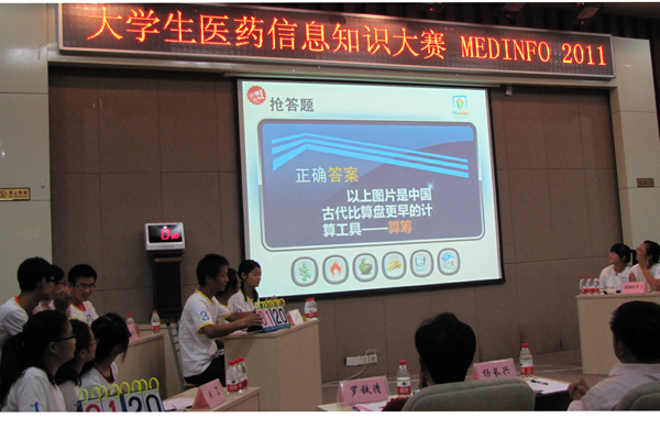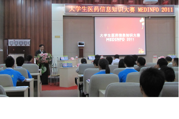 10 月 22 日 上午 ,大学生医药信息知识大赛( MEDINFO2011 )在含浦校区国际交流中心报告厅举办。党委副书记、副校长黄政德、人民邮电出版社高教出版中心主任邹文波出席,学生处、教务处、人文信息管理学院负责人及部分师生代表参加。大赛特邀教育部高等学校计算机基础课程教学指导委员会医药类计算机基础课程教学指导分委员会委员、湖南省高教学会计算机教育专业委员会常务理事、中南大学杨长兴教授,省高教学会计算机教育专业委员会常务理事、湖南大学博士生导师骆嘉伟教授,长沙医学院计算机系主任刘蓉教授以及我校计算机系主任罗铁清副教授、计算机实验中心副主任曾刚老师担任评委。