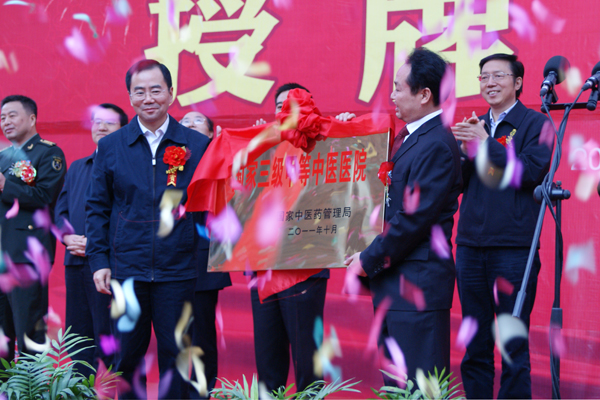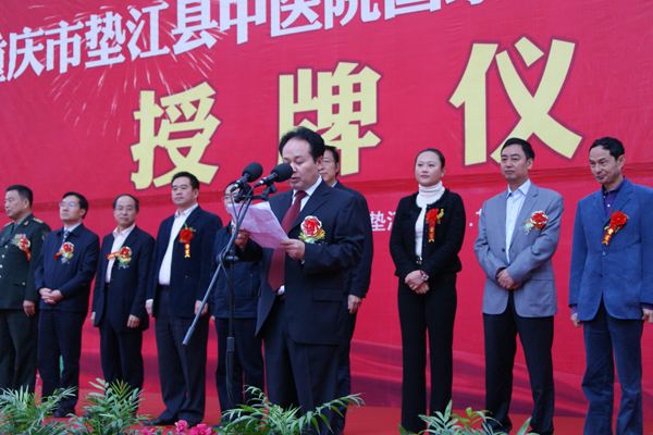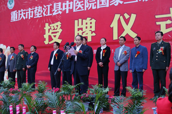 授牌仪式由垫江县委副书记、县政府代理县长梅时雨主持,重庆市卫生局副局长方明金宣读《重庆市卫生局关于批复垫江县中医院为国家三级甲等中医医院的函》,重庆市人民政府副市长吴刚向垫江县中医院授予“国家三级甲等中医医院”金色匾牌。