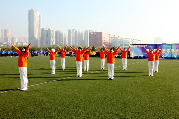 当天,体育馆赛场上人山人海,横幅高悬,参赛的职工队伍与学生队伍阵容整齐,衣装鲜亮,风姿飒爽,英气勃勃。 14 个教职工参赛代表队与 12 个学生参赛代表队依次出场,他们整齐的步伐、嘹亮的口号充分展示了杏林师生的青春与活力;他们朝气蓬勃、精神抖擞,在一舒一展中充分体现了杏林师生良好的精神面貌。场上评委根据各代表队精神面貌、进出场、动作自然、到位、准确、整齐等方面的表现进行了认真评审。