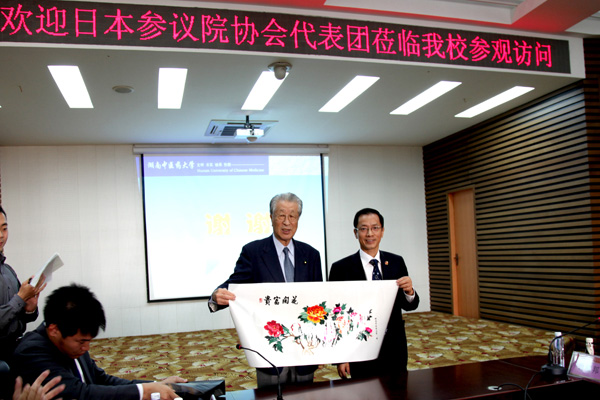 廖端芳向代表团成员简要介绍了我校基本情况,宫琦秀树团长向我校致以衷心感谢,并特别提及当日本发生“ 3.11 特大地震、海啸”时,中国人民无私伸出援手,从人力、物力等等方面给予日本莫大支持,令日本人民深受感动。随后,代表团成员就中医药的特色、对比西医的优势所在、中国医学院校的运作模式等问题与我校专家展开了座谈与探讨,希望与我校加强联系和进一步合作。