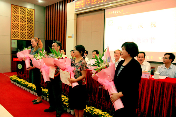 9 月 9 日 下午 ,我校庆祝第 27 个教师节大会在国际教育学院报告厅举行,对一年来我校的湖南省教学特别奉献奖获得者、校级教学名师、校级青年骨干教师进行了表彰。全体校领导出席,处级干部、教师代表、学生代表、省、市、区人大代表、政协委员、各民主党派主委参加会议,会议由校长廖端芳主持。党委书记蔡光先作重要讲话。