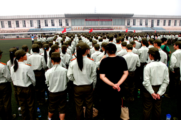 上午 9 时整,军训动员大会准时开始, 2011 级新生身着崭新的绿色军装,排着整齐的队列,军姿飒爽,意气风发。大会伊始,全体肃立,庄严的国歌奏响,严谨肃穆。