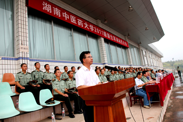 陈弘作军训动员报告,代表校党委行政热烈欢迎 2011 级新生与国防科技大学各位教官的到来,指出,作为新生大学生活崭新一页的开始,军训是学校教育的一个重要环节,同时也是提高全民国防能力的一个重要过程,能巩固国防、激发理想,磨练意志,振奋精神,训练作风,凝聚团队。陈弘介绍了我校的发展历史,并寄语新生,要收获“坚定的意志,坚强的品德,良好的作风,开阔的胸襟,强健的体魄”,以更高、更快、更强的姿态,昂首阔步走在人生道路上。