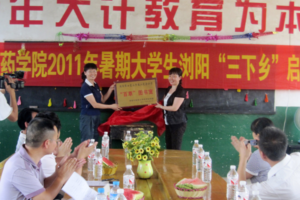 7 月 6 日 ,药学院“科技兴农”志愿服务团队携手天龙制药有限公司,赴浏阳七宝山开展了“情系中医药·关爱暖人心”暑期“三下乡”社会实践活动。此番药学院共捐赠各类书籍近 1000 册,发放宣传资料 10000 余份,赠送各类药品 8 万余元,接待和诊治病人达 400 多人次。