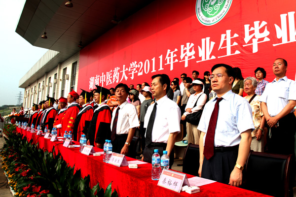 随着廖端芳宣布:“ 2011 届毕业典礼现在开始。”慷慨雄壮的国歌和深情大气的校歌响起,全体肃然起立。饱满有力的歌声,彰显杏林学子们的热情依旧。