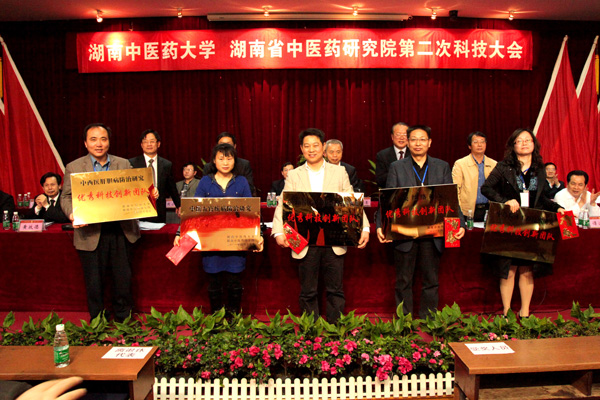 大会表彰了在“十一五”建设期间表现突出的优秀重点学科 7 个:省级优秀重点学科中医诊断学、中医内科学、针灸推拿学、中西医结合临床、中药学与校级优秀重点学科中西医结合基础、中药化学与分析。优秀科技创新团队 5 个:中药粉体工程技术研究团队、针灸经络研究团队、中药新药创制与资源综合持续利用团队、中医五官疾病防治研究团队、中西医肝胆病防治研究团队。优秀科技工作者 13 位:邓常清、卢芳国、孙克伟、朱克俭、刘柏炎、严洁、陈立峰、何迎春、李顺祥、贺福元、常小荣、彭清华、谭克理。优秀科技管理工作者 6 位:刘翔、易亚乔、罗跃龙、蒋文明、谢梦洲、雍苏南。来自针灸推拿学院的常小荣教授与基础医学院的卢芳国教授分别作为优秀科技创新团队代表与优秀科技工作者代表发言。