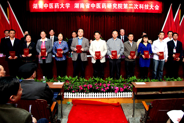 省教育厅党组成员、副厅长申纪云、省科技厅副巡视员周上游、省发展和改革委员会高新技术处副处长张双奇、省中医药管理局副局长毛泽禾、省教育厅科技处处长左清、省科技厅奖励办主任谭立刚、省科技厅计划处副处长王先民、我校领导蔡光先、廖端芳、谭达全、黄政德、吕祖建、周小青、蒋士生、何清湖、秦裕辉、原院长陈大舜、原副校长滕久祥等领导与嘉宾出席奖励大会并为获奖代表颁奖。申纪云、周上游作重要讲话,学校党委书记、研究院院长蔡光先作工作报告,校长廖端芳主持奖励大会,党委副书记、副校长黄政德宣读《关于表彰湖南中医药大学、湖南省中医药研究院“优秀科技创新团队、优秀科技工作者、优秀科技管理工作者”的决定》。