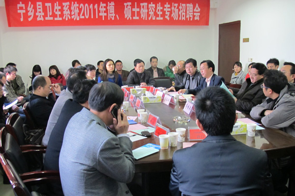 宁乡县是原国家主席刘少奇的故乡,目前县域基本竞争力居全国第 73 位,中部十强第 7 位。宁乡县党委历来十分重视医疗卫生事业的发展,现已建成县直医疗卫生单位 7 家,乡镇卫生院 33 家,眼科专科医院 1 家,为满足宁乡县人民群众的医疗需求做出了重要贡献。宁乡县作为我省首批基层医疗卫生机构综合配套改革试点县,各项医改措施正全面推进,受到社会各界的广泛关注,医疗卫生事业正朝着稳定、健康的方向快速发展。为满足这一发展需求, 2011 年该县计划面向社会公开招聘医疗卫生专业博硕士研究生 99 名。此次便是以我校为首站,举行这一专场招聘会,招引高素质人才。我校副校长何清湖、纪委书记秦裕辉、宁乡县人大常委会副主任谢文军、人民政府副县长李平等双方领导出席了招聘会开幕式,我校研究生处、学生处、宁乡县卫生局、编办、纪委、人才交流中心和各用人单位等负责人均参加了招聘会。