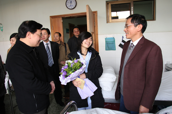 自从我校医学院大一学生胡双无私助人一事被媒体报道后,胡双的家境与病情受到了学校的高度关注。继前两天纪委书记秦裕辉至宿舍现场慰问胡双后,今天,廖端芳又与秦裕辉一道,率党委宣传部与学生工作处相关负责同志,在医学院张秋燕副院长一行陪同下,赶到胡双所在的湘雅二医院,看望了她,现场为胡双送上了鲜花和慰问金,并告诉胡双,要安心养病,尽快地恢复健康,回到校园,治病所需的费用不要太担心,学校会想办法。