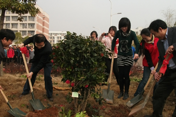 校团委书记谭琥、后勤处绿化科科长周大寒、校团委全体老师以及长沙血液中心部分科室负责人出席了本次植树活动。