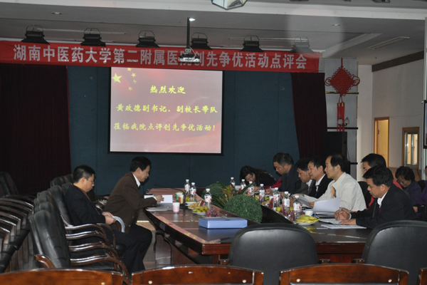 11 月1 1 日上午 ,学校党委副书记、副校长黄政德在省中医药研究院党办、院办主任周钊和的陪同下,到第二附属医院对创先争优活动进行领导点评。医院党委书记、创先争优活动领导小组组长陈祥瑞作题为《以公开承诺引领创先争优活动,扎实推进医院又好又快发展》的创先争优活动汇报,院长、创先争优活动领导小组副组长肖四旺主持会议,医院党委成员、创先争优领导小组成员、党支部书记和党员代表参加了领导点评会。