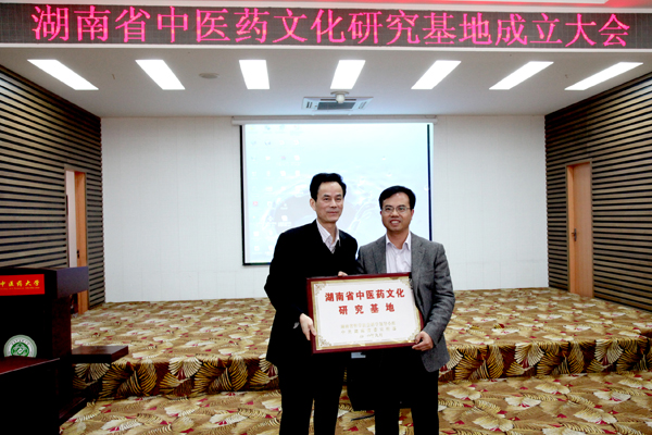 11 月 25 日 上午 ,我校含浦校区办公楼一楼会议室气氛热烈,掌声连连,湖南省中医药文化研究基地成立大会正在进行,基地负责人、我校党委副书记陈弘郑重地从中共湖南省委宣传部巡视员李湘舟手中接过上书“湖南省中医药文化研究基地”的崭新牌匾。出席成立大会的领导还有省社科规划办主任骆辉、省社科规划办公室副主任王礼生以及我校党委书记蔡光先、党委副书记、副校长黄政德、基地首席专家、我校副校长何清湖。会议由黄政德主持。