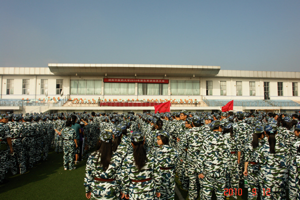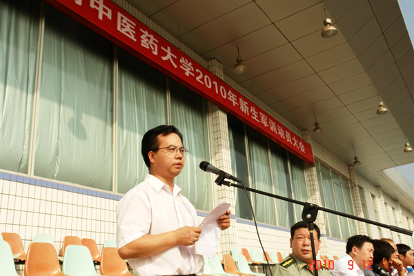 骄阳似火,激情如歌。还带着来校时一路奔波的劳顿,刚刚到校的新生们今日穿上迷彩衣,开始了他们为期两周的军训。 9 月 12 日上午 ,我校 2010 级新生军训动员大会在含浦校区体育馆隆重举行,研究院党委书记、学校副校长 谭达全、学校党委副书记陈弘出席大会。