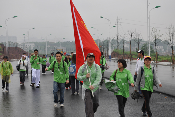 5月8日清晨,全体队员集结在含浦校区南大门,出征仪式在这里简单而隆重的举行。校领导蔡光先、陈弘、吕祖建、蒋士生、秦裕辉出席,蔡光先作出征动员并授旗。此时此刻,天空下着雨,但丝毫没有阻挡住队员们出征的热情,校领导与队员们一道高唱着《团结就是力量》。我们出发了!