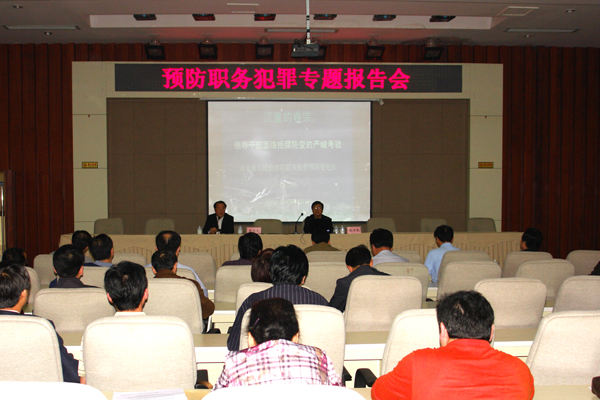 下午,全体校领导、新任处级干部在国际教育学院报告厅听取了省检察院预防职务犯罪处处长饶力明关于预防职务犯罪的专题报告。饶力明结合自己多年的办案经验,就职务犯罪的特点、职务犯罪的根源、职务犯罪的心理分析及如何预防职务犯罪四个方面进行了深刻生动的阐述,让与会人员受益匪浅。学校和研究院副处级以上干部、校和研究院机关副科级以上干部,二级学院办公室主任和学生科长同时参加了报告会。