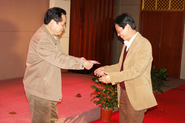 (副校长、校工会主席谭达全教授为合唱团团长肖子曾教授颁发聘书)