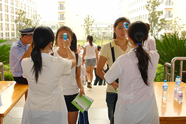 医疗中心为每一位新生测量体温,严防甲流传播。