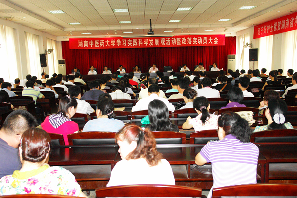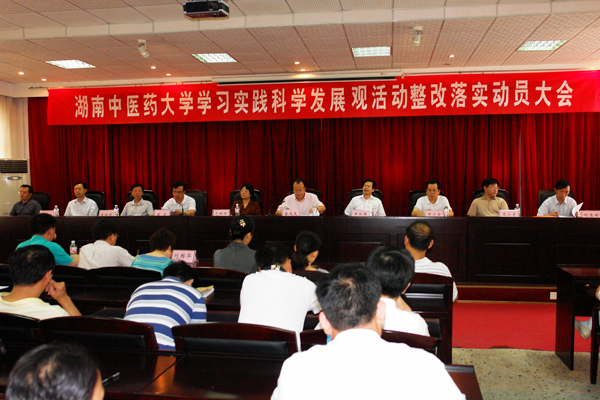 7 月 6 日上午,我校在第一附属医院多功能会议厅召开深入学习实践科学发展观活动整改落实动员会。学校领导蔡光先、尤昭玲、黄政德、陈弘、谭达全、吕祖建、周小青、蒋士生、何清湖、秦裕辉、省委第八指导检查组成员刘国华、申海洋出席大会,党委书记蔡光先书记做动员讲话,大会由校长尤昭玲主持。