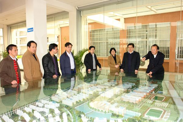 张健厅长一行观看新校区微缩模型,并实地参观新校区。