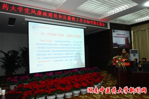 党委书记蔡光先作了题为《服务大局,标本兼治,整体推进党风廉政建设和反腐败工作》的工作汇报,从高度重视党风廉政建设和反腐败工作、坚持抓好党风廉政建设责任制建设、坚持抓好制度建设、坚持抓好作风建设、党风廉政建设和反腐败工作创新、今后努力方向七个方面向专家组汇报了我校党风廉政建设工作情况。
