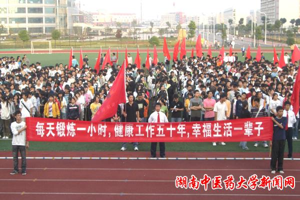 人文信息管理学院院长张炳填教授宣读《第二届全国亿万学生阳光体育湖南中医药大学冬季长跑活动方案》, 2008 年 10 月— 2008 年 11 月为“爱我校园”长跑月,同学们每天在校园内跑 2000 米距离; 2008 年 12 月— 2009 年 2 月为“阳光体育与我同行—冬季长跑”,同学们每天跑 2000 米— 3000 米的距离; 2009 年 3 月— 2009 年 4 月为“春季健身长跑月”,同学们每天跑 2000 米距离; 2008 年 10 月— 2009 年 4 月定为“课课跑”活动期间,要求同学们由任课教师在体育课内组织每次 1500 米长跑距离。
