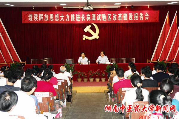 7 月 1 日 下午,学校在东塘校区学术报告厅隆重召开“继续解放思想,大力推进长株潭试验区改革建设”专题报告会,邀请省委党校哲学教研部部主任覃正爱教授主讲,党委书记蔡光先教授主持报告会。参加庆祝建党 87 周年的全体领导、党员代表和民主党派负责人聆听了报告会。
