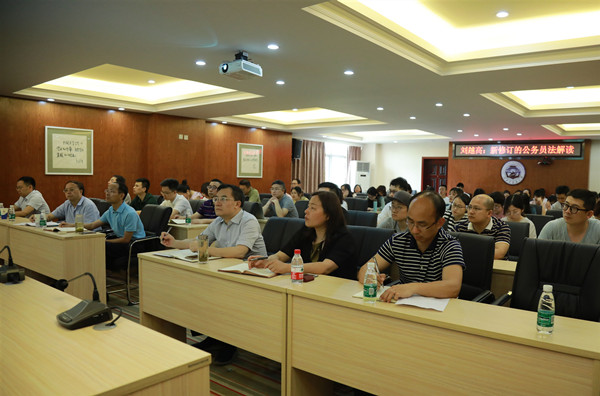 刘越高从公务员法的历史沿革、修法背景、新法之新、重大改革、学法认识等五大方面进行了详细解读,重点阐述了新修订的坚持和坚强党的领导、强化公务员队伍的政治属性、职务与职级并行制度、优化分类管理、强化公务员从严管理及激励公务员担当作为、完善公务员管理环节等七个方面。