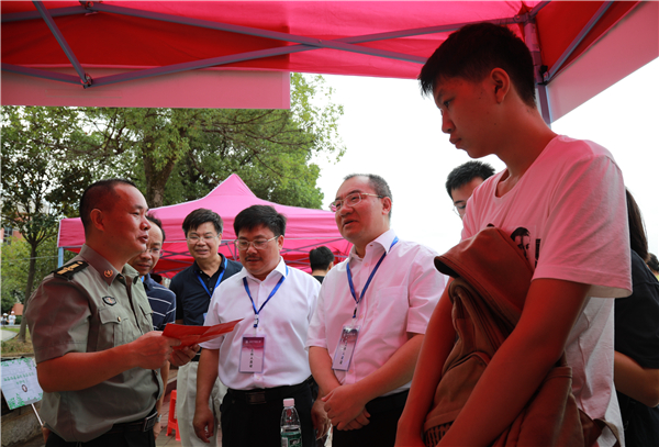 上午九时许,校(院)党委书记秦裕辉,校(院)长戴爱国,校(院)党委副书记肖小芹,副校长何清湖、葛金文、彭清华,校(院)纪委书记张玉芬,副校长易刚强、熊辉,校(院)党委委员、组织人事部长廖菁,校(院)党委委员、宣传(统战)部长焦珞珈一行依次走访各院各单位迎新现场,时而驻足停留,时而仔细观摩,细致询问迎新工作进展情况,热心慰问坚守岗位的老师及学生,并与家长及新生亲切合影留念。在财务大厅,对依旧延续的绿色通道、门外张贴的公开清晰的收费项目及收费标准,表示赞许;在各院组织迎新点,仔细询问新生报到情况,对各种花式迎新方式连连称赞,鼓励学生继续创新,用心用情;在新生兵役登记处,详细了解今年兵役登记政策,鼓励学生积极响应;在研究生院,认真查看新生签到表,要求确保学生安全到达学校;在装修一新的学生食堂,重点了解智慧餐厅的情况,并与前来就餐的新生及学生家长亲切交流。